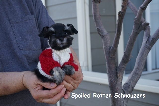 Tova is one of the smallest puppies in the litter, not to mention, he is MEGA GORGEOUS!!! He has tiny feet, tiny ears, and a tiny button nose. Tova even has that hard to find “pixi face” that everyone loves so much. We are located in Utah. Shipping is $350 anywhere in the United States, however, he might be too tiny to ship which means you’d have to come into Salt Lake City to pick him up. We can meet you at the airport so you can fly back home the same day! Yah! Tova is a teacup\tiny toy phantom black and silver schnauzer and was born to be a star. He truly is amazing!
